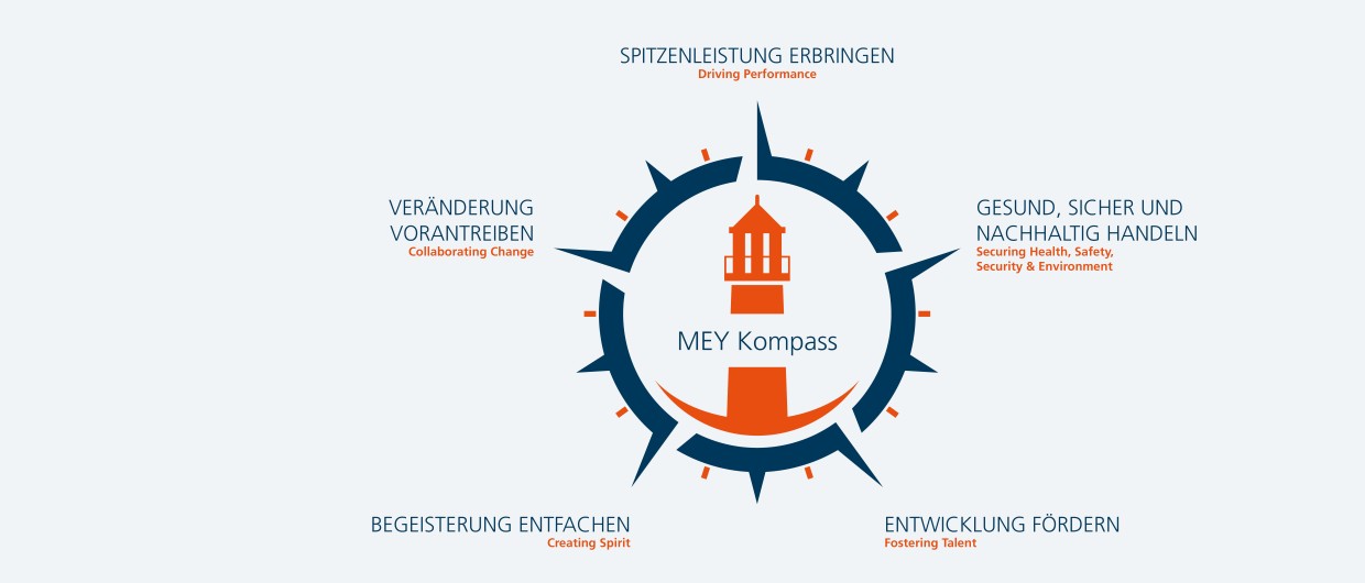 The MEY Compass sets out the principles of conduct within the MEYER WERFT Group and provides employees and managers with guidance for good and successful cooperation. The MEY Compass clearly defines the principles that shape cooperation within the company – for both employees and leaders.